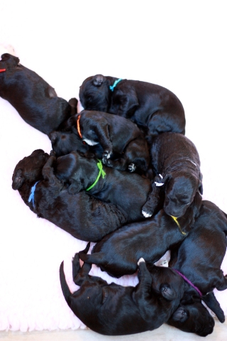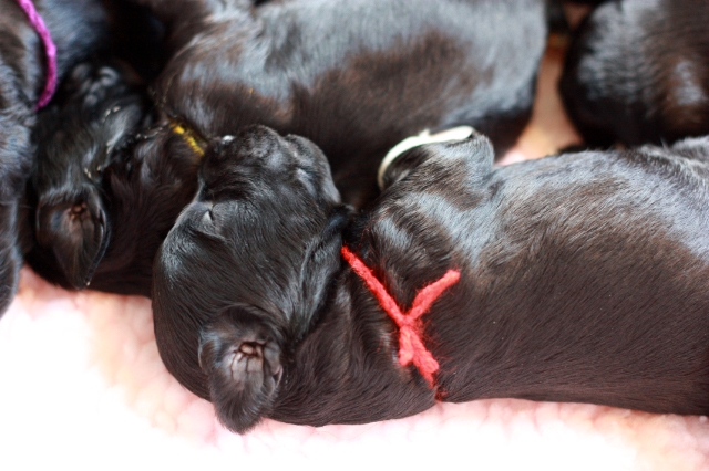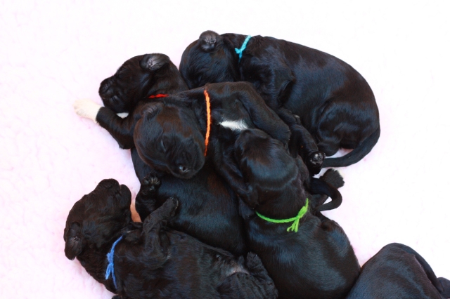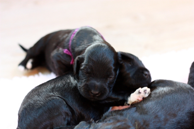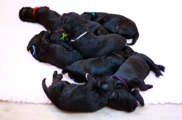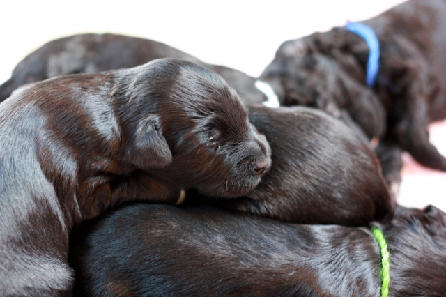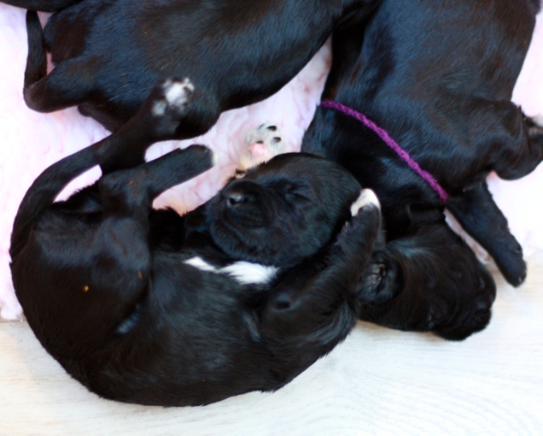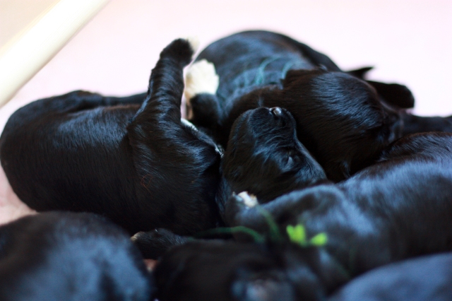 Nå ligger de i valpekassen og lager godlyder og er gode og mette.