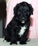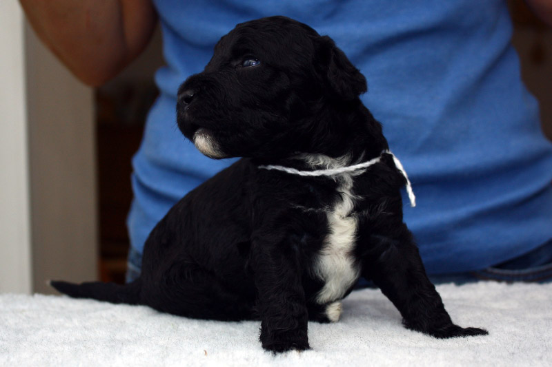 Hvit» veide 262 g når han ble født. Allerede etter en uke så vi at pelsen var litt mer bølgete enn de fleste av de andre valpene. Det blir spennende å se om han blir krøllete eller bølgete. Han var den første som begynte å åpne øynene på dag 15 og utmerket seg tidlig som en ordentlig kosegutt.