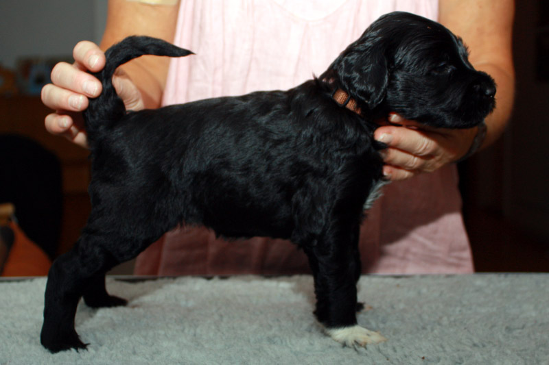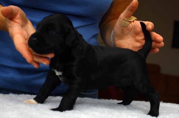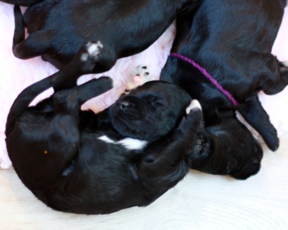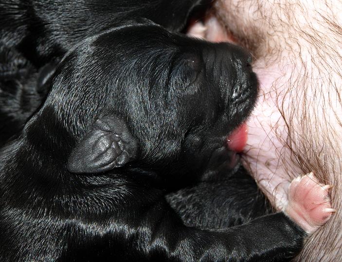 Hun veide 246 g da hun ble født og kom som nr. 1. Pelsen er fortsatt glatt, så jeg regner med at hun blir bølgete som voksen. Hun åpnet øynene på dag 18.