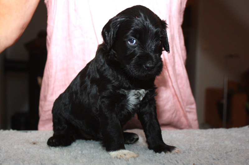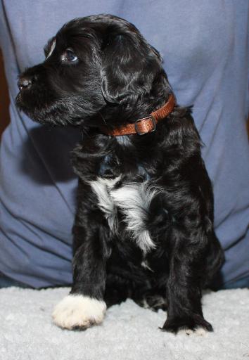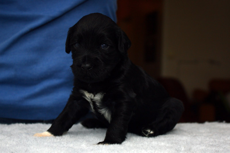 Kjennetegn: Sort med hvitt bryst. Hvit høyre forlabb og litt hvitt på venstre forlabb – akkurat som sin mor, men høyre og venstre er byttet om. Sorte bakben.